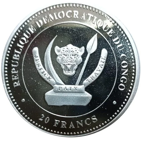 Raised rim, outer beaded circle. Center: Congolese coat of arms above value, within a linear circle.