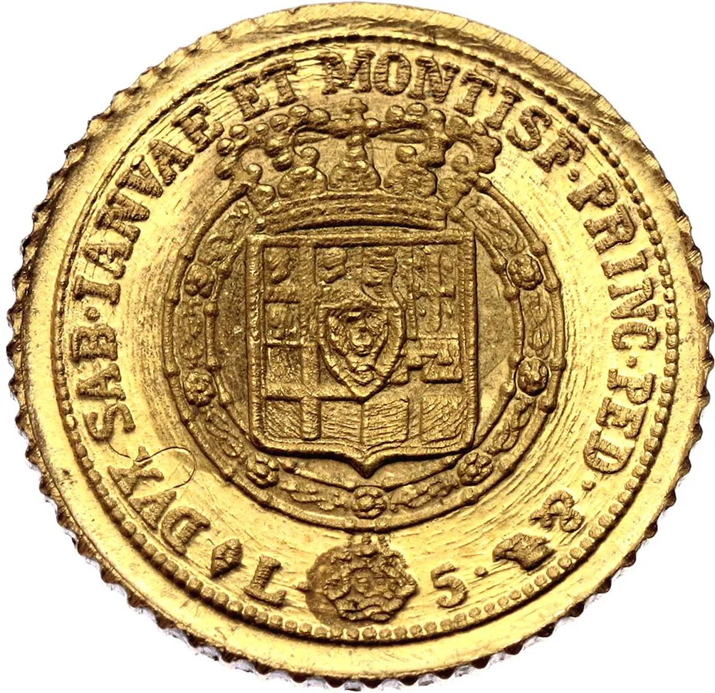 Shield with quartered arms, central Savoy eagle, encircled by order collar, "L. 5." flanking mintmarks below.