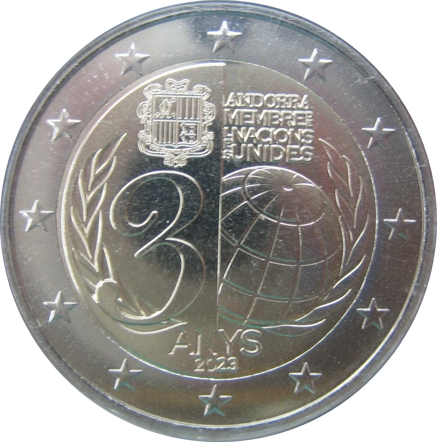 A crowned globe with Andorra's coat of arms above, encircled by the 12 stars of the EU.