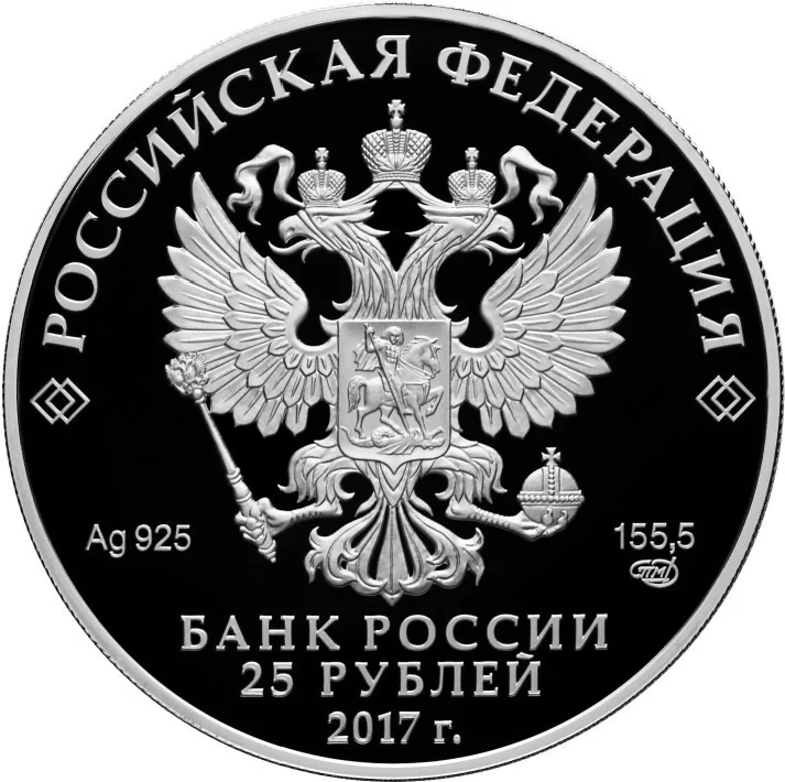 The obverse features the State Coat of Arms of the Russian Federation, along with inscriptions for "RUSSIAN FEDERATION," "BANK OF RUSSIA," "25 ROUBLES," "2017," metal specifications, mint mark, and fine metal content.