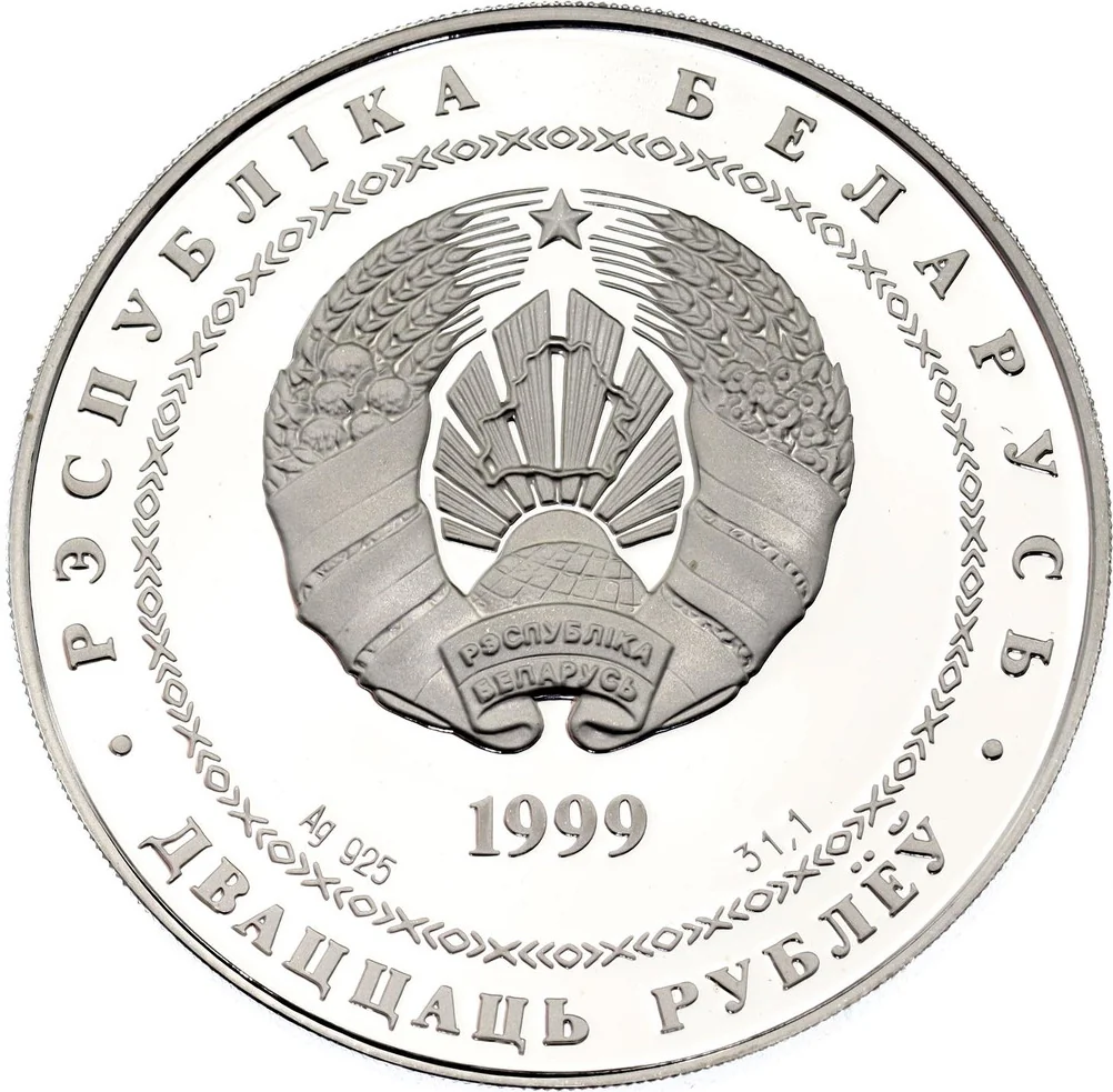 Description: The circular ornament features the relief of the State Coat of Arms. Below are the year, silver content, and alloy standard. The rim inscriptions: "РЭСПУБЛIКА БЕЛАРУСЬ" above and "ДВАЦЦАЦЬ РУБЛЁЎ" below.