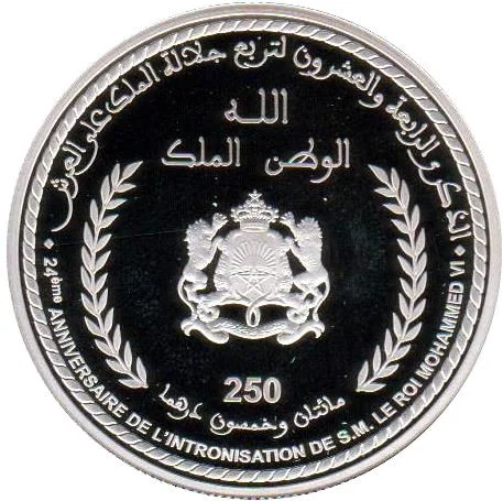 Description: The reverse features the inscription "الذكرى الرابعة والعشرون لتربع جاللة الملك على العرش" with its French translation below. The central design is the Kingdom's Coat of Arms flanked by olive branches, topped by the motto “الله, الوطن, الملك” and the face value "250 مائتان و خمسون درهما".