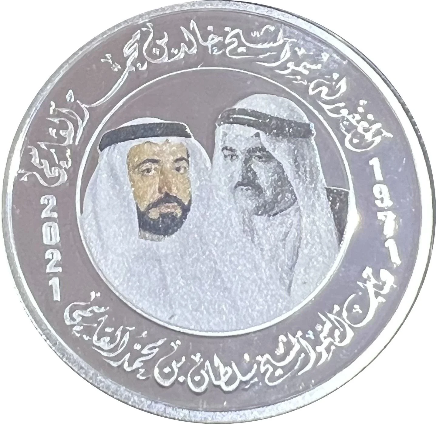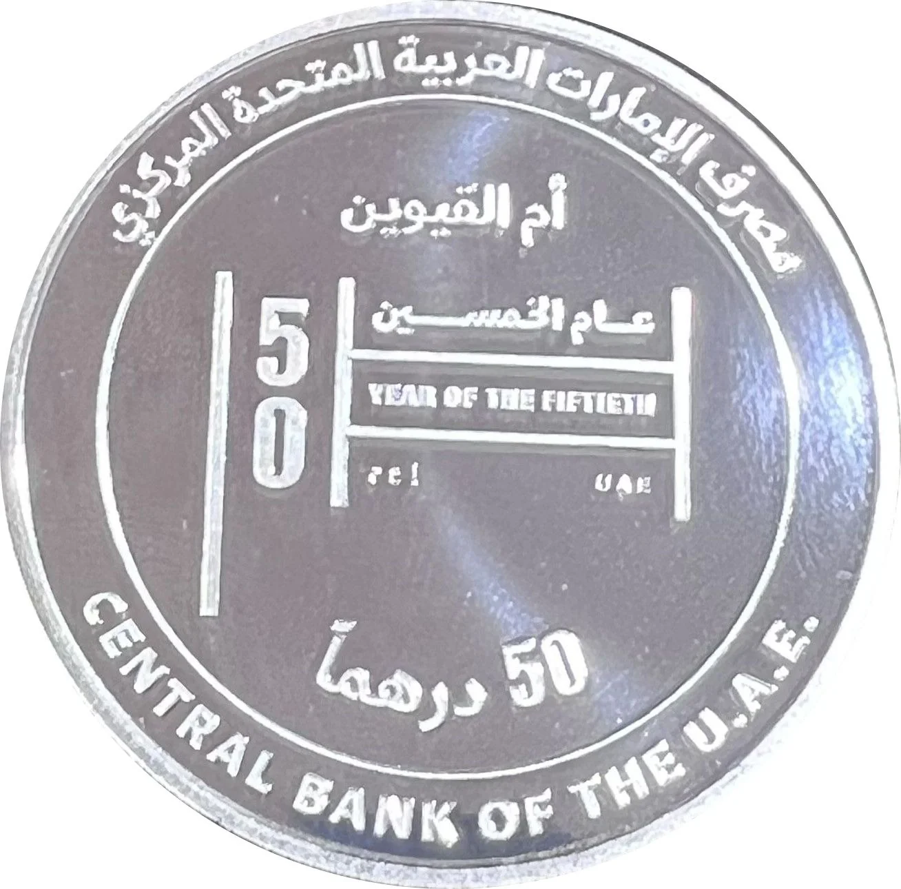 UAE Central Bank name in Arabic and English, coin value, encircling a 50th-year logo.