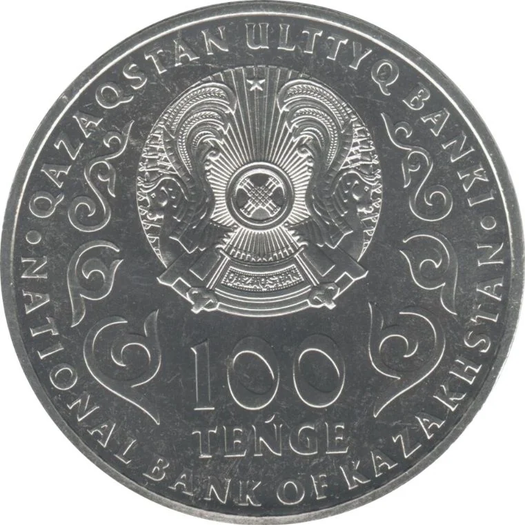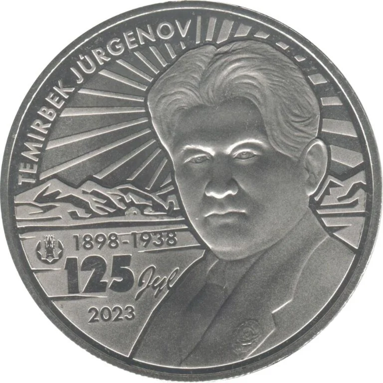 Description: Portrait of Temirbek Zhurgenov against a steppe and mountain sunrise. The upper left bears the circular inscription "TEMIRBEK JÚRGENOV." To the left are the National Bank of Kazakhstan logo, his lifespan (1898-1938), the 125th anniversary, and the coin's minting year.