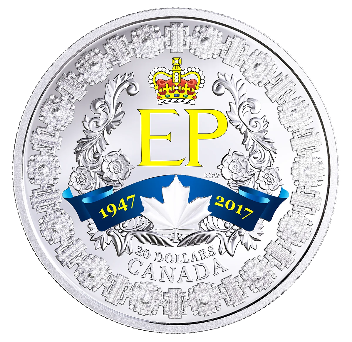 The Royal Monogram and St. Edward's Crown, flanked by scrollwork forming a diadem, with a maple leaf foreground. Set on a vivid blue ribbon, the engraved dates "1947" and "2017" mark the royal platinum wedding.