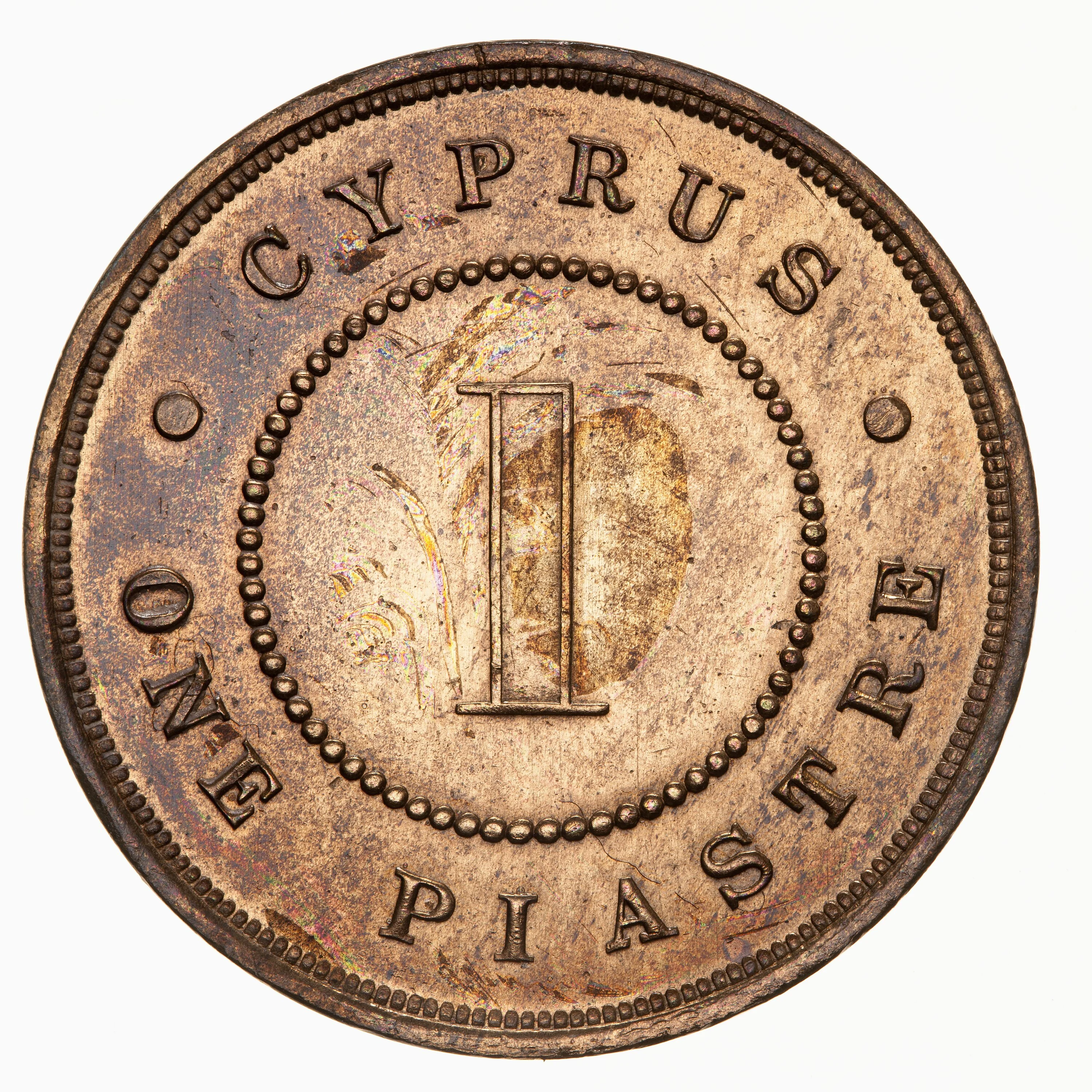 CYPRUS · ONE PIASTRE within a bead circle.