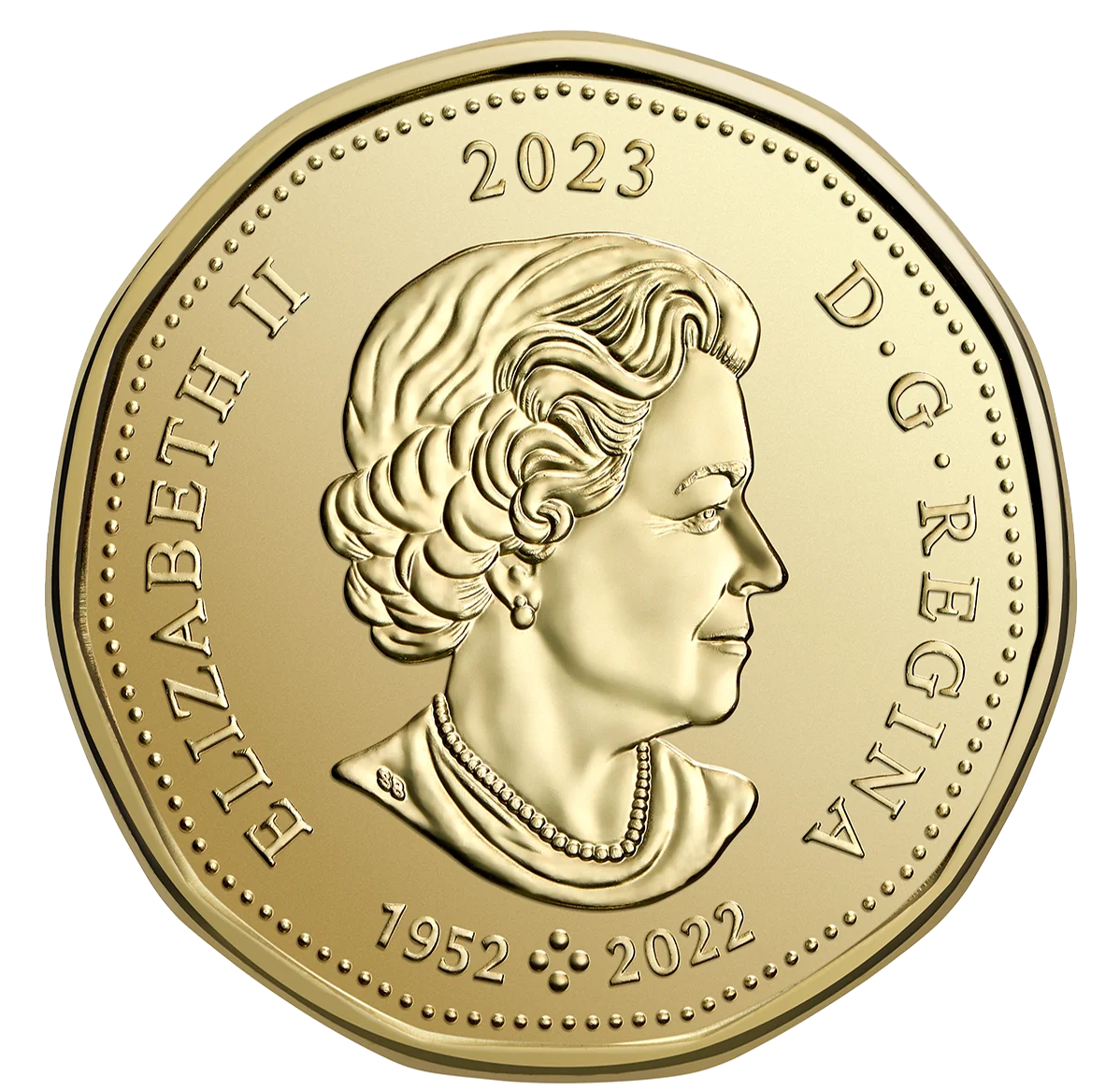 Queen Elizabeth II at 77, facing right, wearing a necklace and earrings. The effigy includes the dates "1952" and "2022," separated by four pearls representing her four coin portraits.