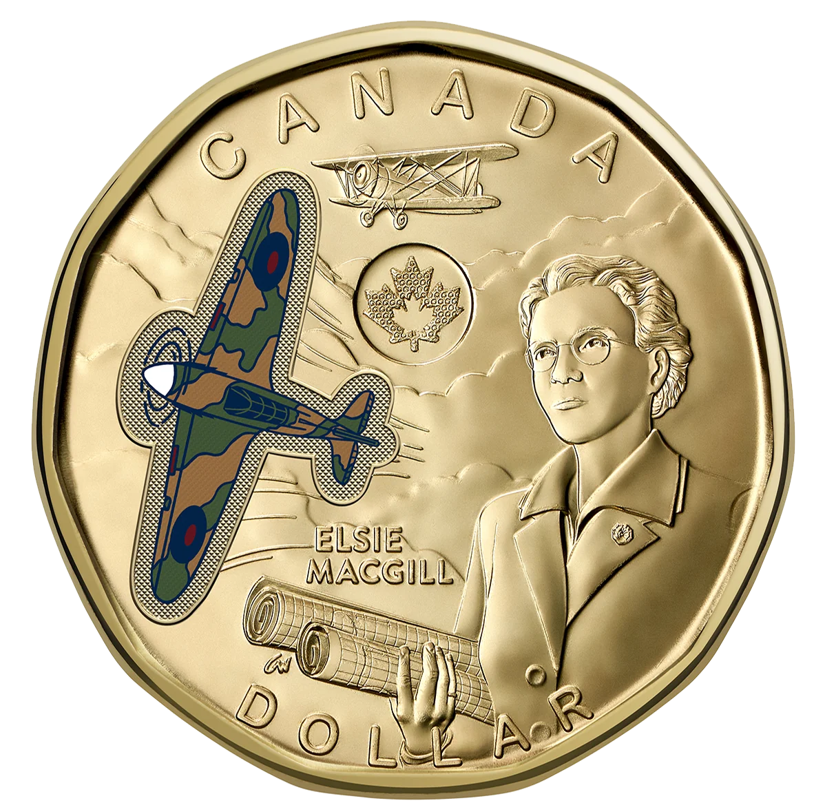 The reverse of the $1 coin features Elsie MacGill (1905-1980), a trailblazing aeronautical engineer and women's rights advocate. Her portrait includes a lapel pin from the Canadian Federation of Business and Professional Women’s Clubs. The sky backdrop highlights her designs, like the Maple Leaf Trainer II, and her role in producing Hawker Hurricanes, shown on the colourized coin.