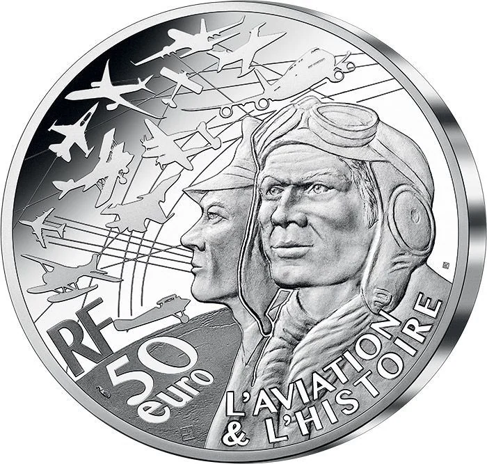 Two pilots embody civil and military aviation across eras, with diverse aircraft filling the sky in tribute to flight history. The reverse features the face value and "RF" symbol.