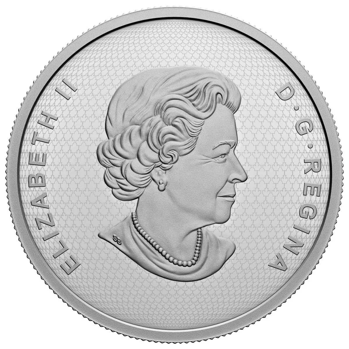 Queen Elizabeth II at 77, facing right, wearing a necklace and earrings against a maple leaf background.