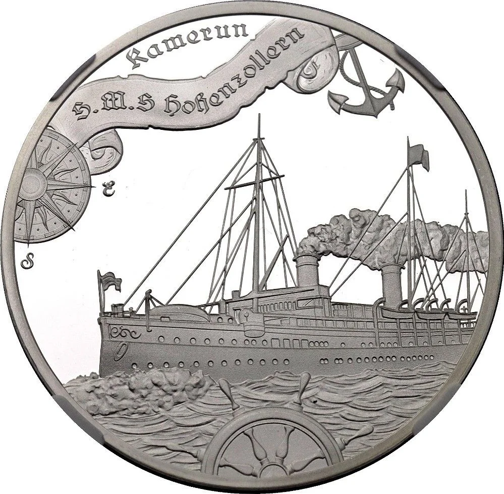 S.M.S. Hohenzollern sailing left, with a compass, anchor, and helm around it.