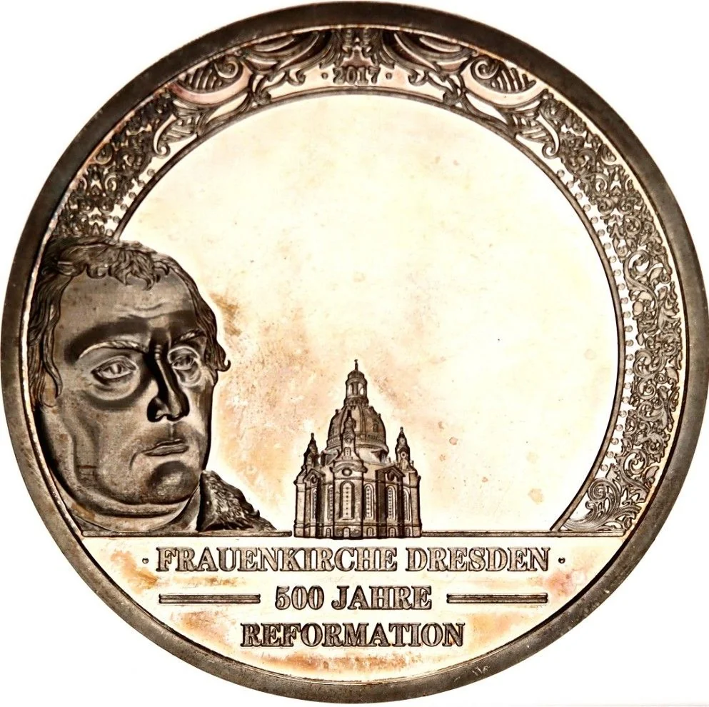 Martin Luther's head faces front-right; Dresden's Frauenkirche exterior is below.
