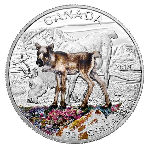 This engraving by Glen Loates depicts a young, curious caribou fawn, brought to life with selective color. It stands upon a vibrant mosaic of tundra flowers, near its meticulously detailed mother. Together they gather strength for their impending migration across the etched, open plains.