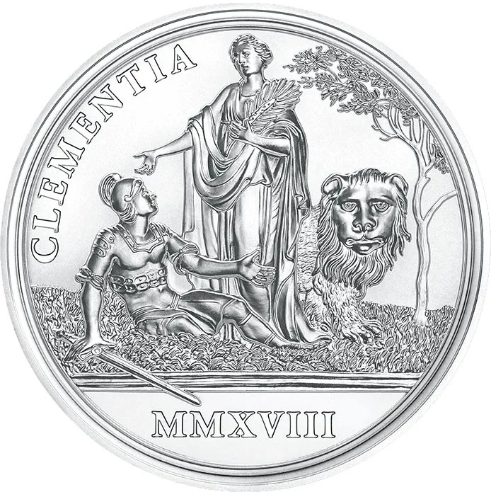 Allegory of Clemency: a woman offers her hand to a fallen soldier, with a lion and tree beside them.