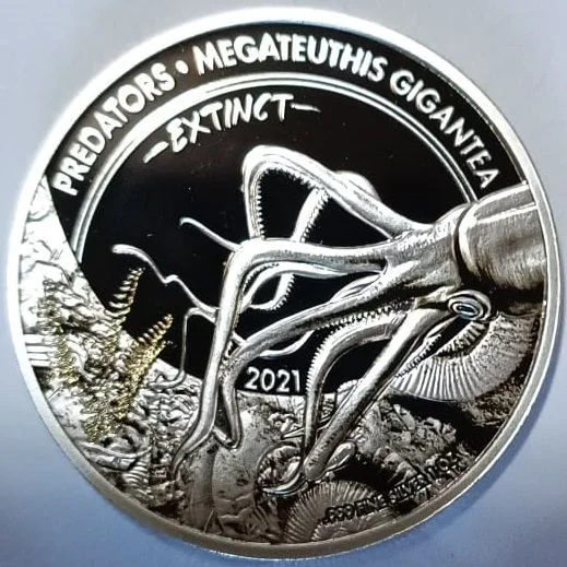 Close-up of a Megatheutis Gigantea, with the series name, coin name, and issue year above it, and the fineness and weight below.