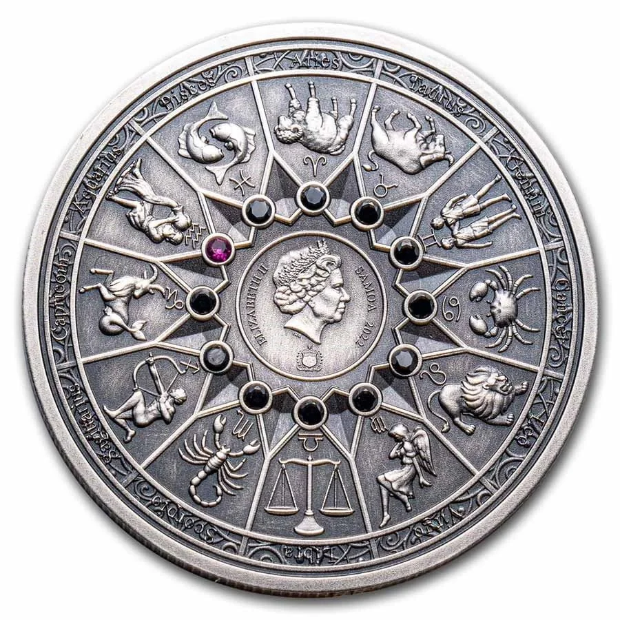 Description: Central portrait of Queen Elizabeth II by Ian Rank-Broadley, with Samoa's small coat of arms below. Twelve zodiac symbols surround, with a red crystal above Aquarius.