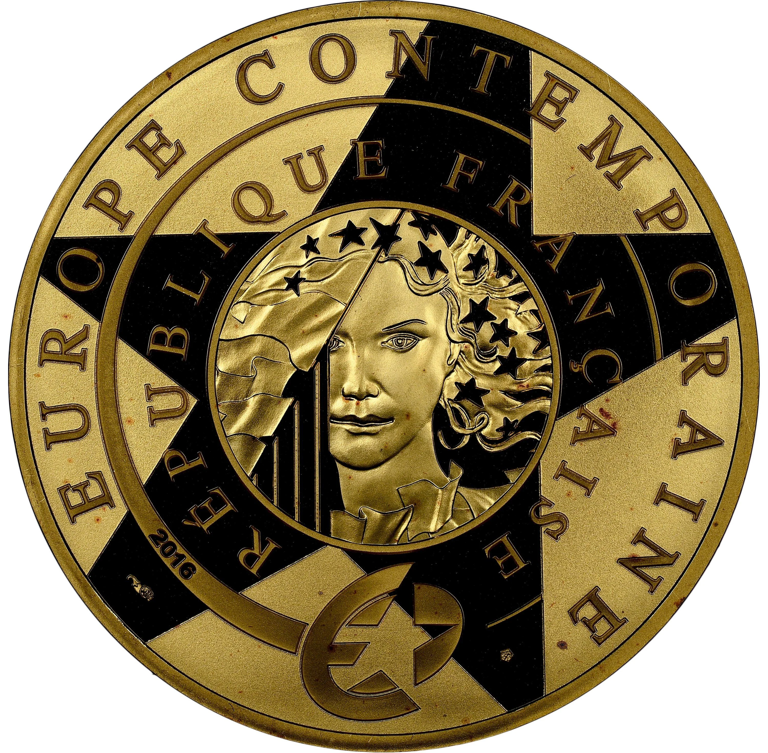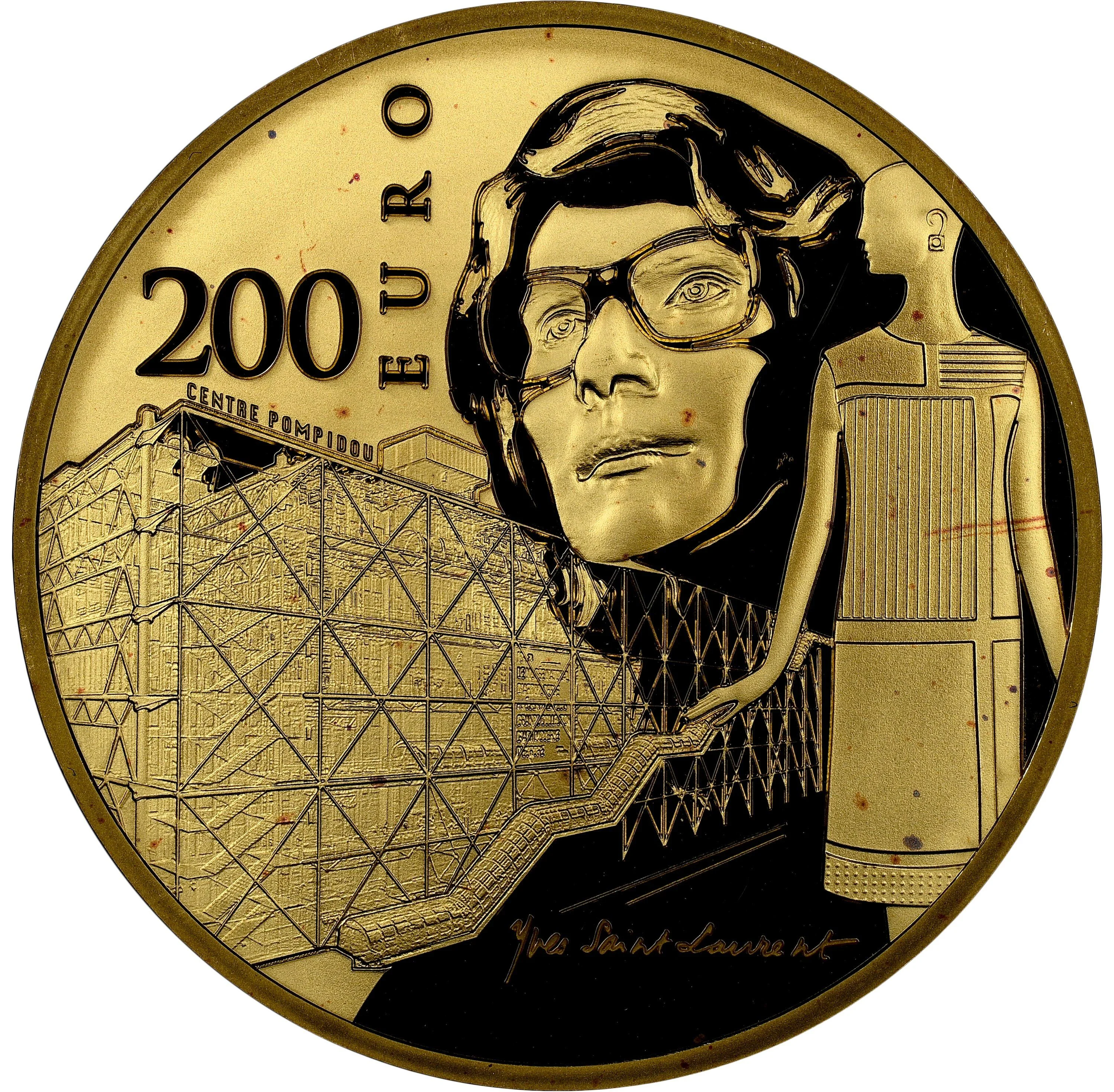 The reverse features the Centre Pompidou, an emblem of modern architecture, and Yves Saint Laurent, a globally influential couturier, on the 80th anniversary of his birth in 2016.