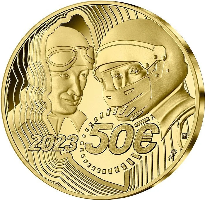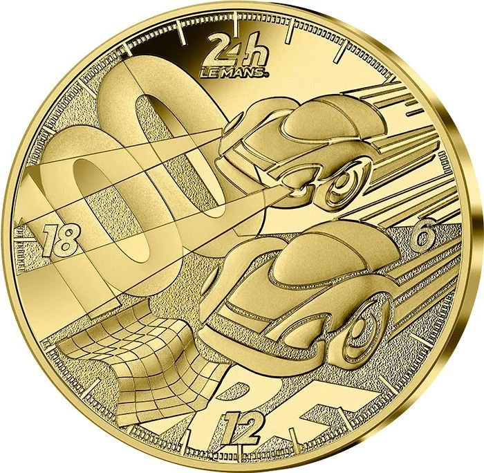 This collector coin's face shows two racing cars in a 24-hour chronometer. Its reverse-polished top creates day/night contrast, with the night car's headlights illuminating the centenary "100" and the road ahead.