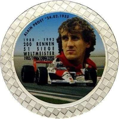Formula 1 car racing on a circuit with spectators and a checkered flag.