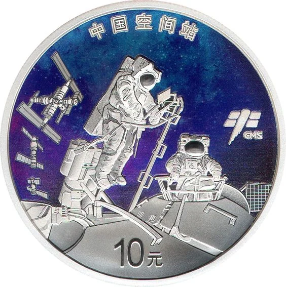 Two astronauts conduct a spacewalk: one on the robotic arm, the other at an airlock. To the left, three icons depict China's crewed spaceflight strategy: launching crewed spacecraft, deploying single-module labs, and assembling the current multi-module station. The Chinese Manned Spaceflight Project (CMS) logo is shown.