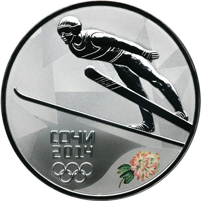 Ski jumper with a Rhododendron branch, Sochi 2014 logo, and Olympic rings.