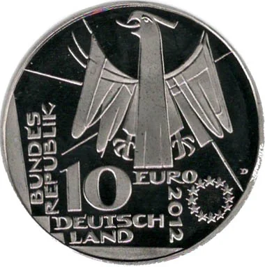The stylized federal eagle is accompanied by the EU stars and "BUNDESREPUBLIK DEUTSCHLAND". Below are the year "2012", face value "10 EURO", and the Munich mint mark "D".