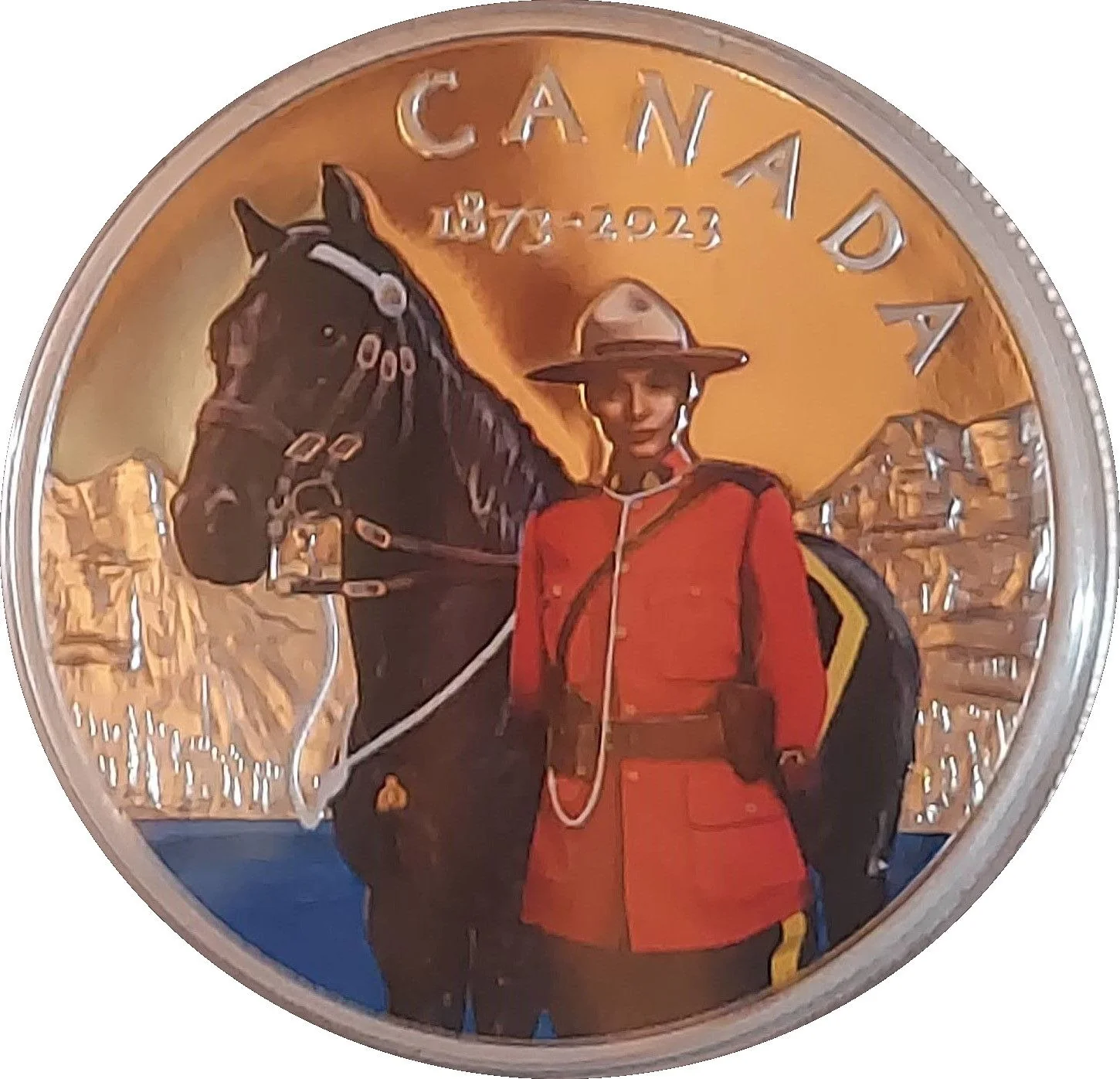 The reverse marks the RCMP's 150th anniversary with a colour-enhanced portrait of a Mountie and her Hanoverian horse.