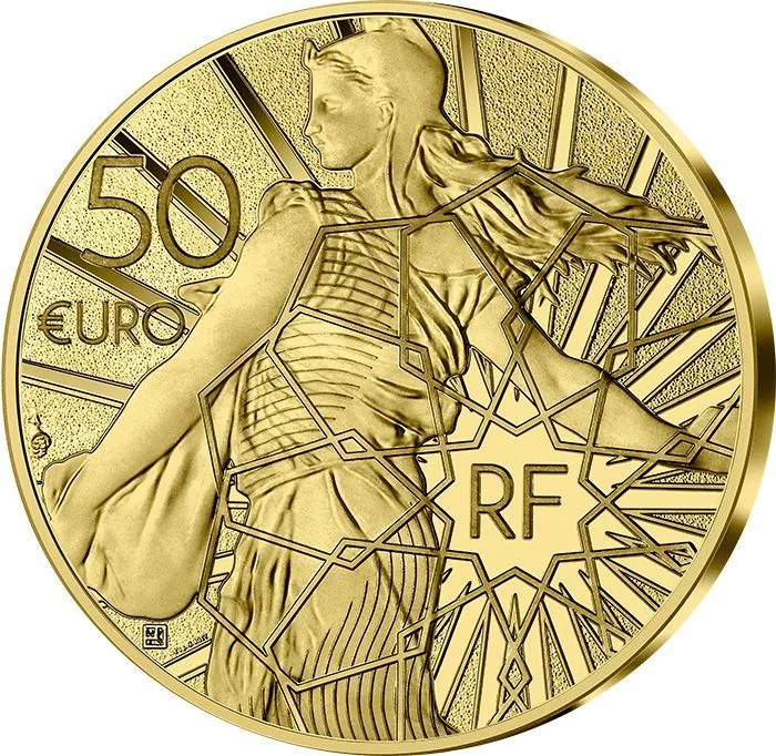 A modern take on Roty’s Sower, her dress flowing as the French flag. "RF" is encircled by a ring of hexagons, evoking France.
