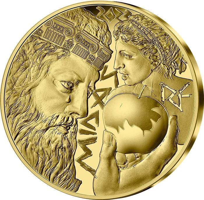 This coin depicts King Midas, whose gift of a golden touch from Dionysos became a curse. It features selective fine gold gilding, echoing the myth of his plight.