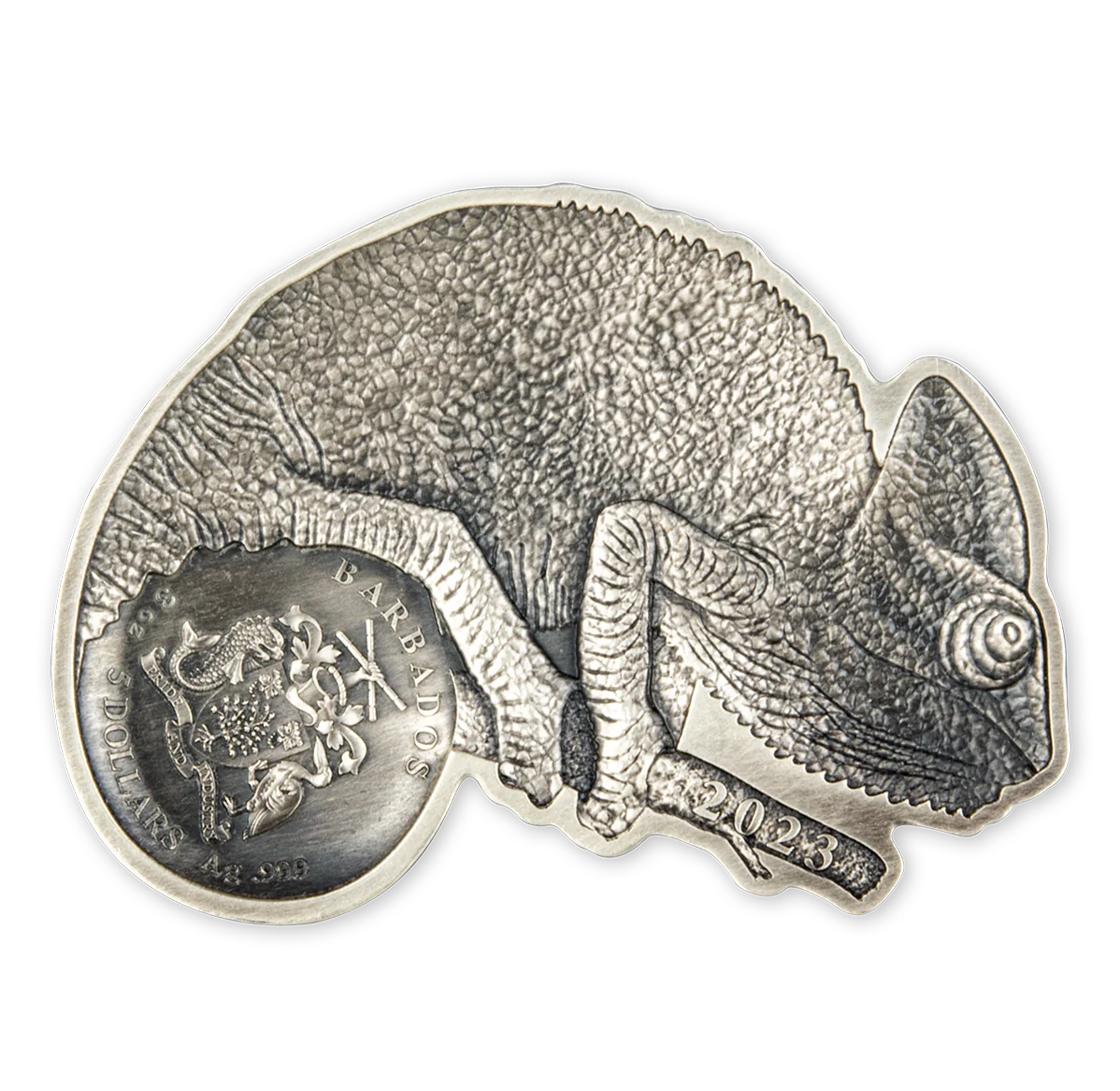 Chameleon on branch above Barbados coat of arms.