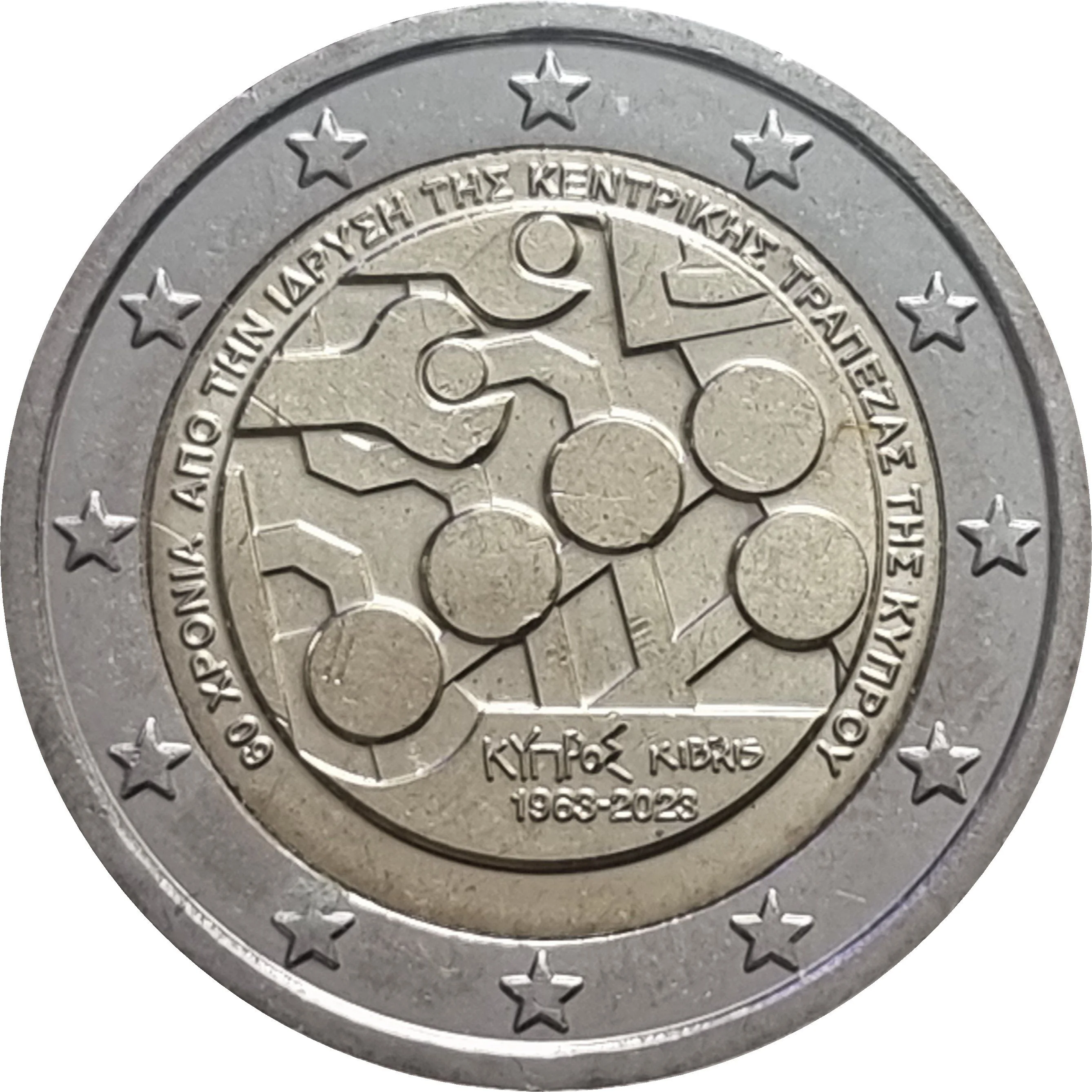 Tools on a microchip symbolise economic stability in the modern industrial and digital era, secured by the Central Bank of Cyprus on its 60th anniversary. The national side features the country name ‘ΚYΠΡΟΣ KIBRIS’, the dates ‘1963-2023’, and the commemorative phrase ‘60 ΧΡOΝΙΑ...’. The outer ring bears the 12 stars of the European flag.