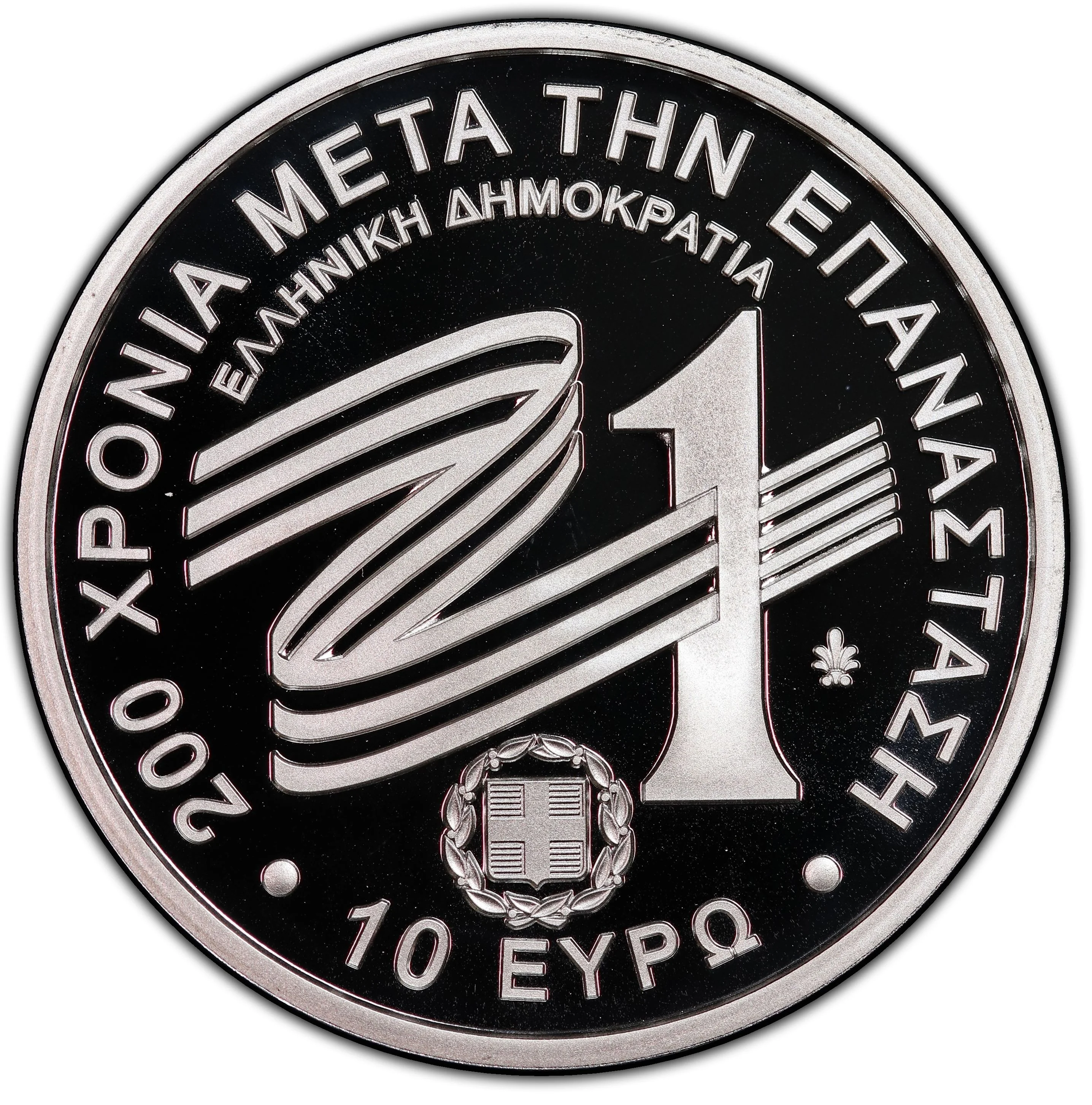 Logo "21" of the "Greece 2021" committee, small Greek Coat of Arms, mintmark, and "ΕΛΛΗΝΙΚΗ ΔΗΜΟΚΡΑΤΙΑ". Inscription: "200 ΧΡΟΝΙΑ ΜΕΤΑ ΤΗΝ ΕΠΑΝΑΣΤΑΣΗ • 10 ΕΥΡΩ".
