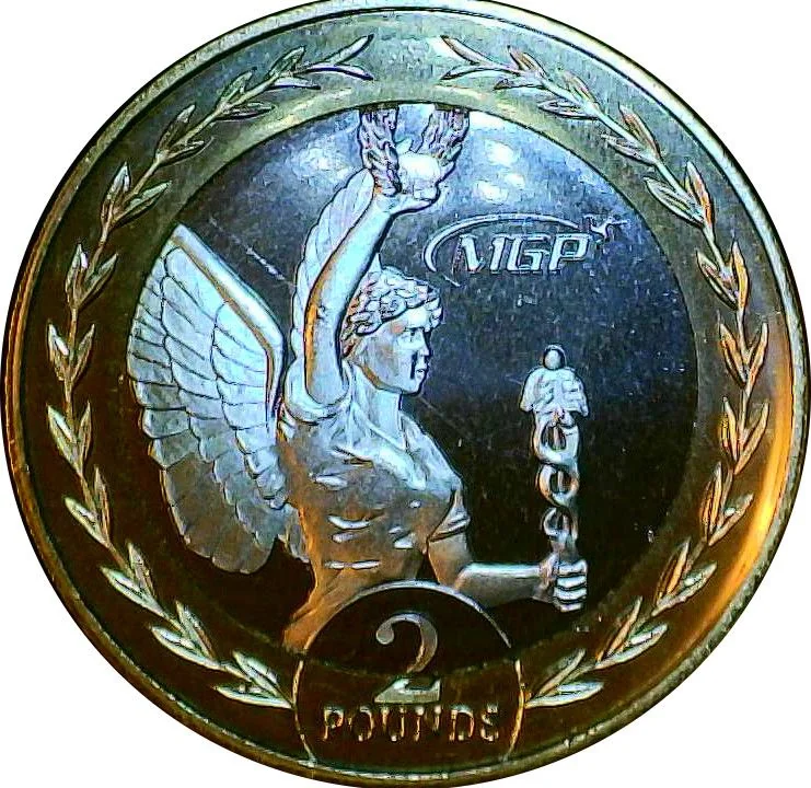 The A.B. Crookall trophy within a laurel wreath, with "MGP" beside it and "2 POUNDS" in a circle below.