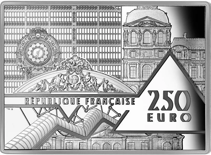 Architectural details of five Paris museums: Orsay, Louvre, Picasso, Rodin, and Pompidou.