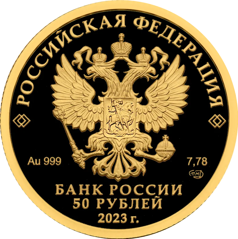 The disc's mirror field features the Russian Federation coat of arms. Above it, along the rim, is the semicircular inscription "РОССИЙСКАЯ ФЕДЕРАЦИЯ," flanked by doubled rhombuses. Below the coat of arms are markings for the metal and fineness on the left, and the fine metal content and mint mark on the right. Centered at the bottom, in three lines, are the inscriptions "БАНК РОССИИ," the coin's denomination, and the year "2023 г."