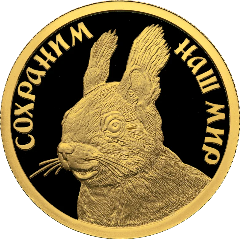 The disc's mirror field features a relief squirrel and the inscription "СОХРАНИМ НАШ МИР" (PROTECT OUR WORLD) around its circumference.