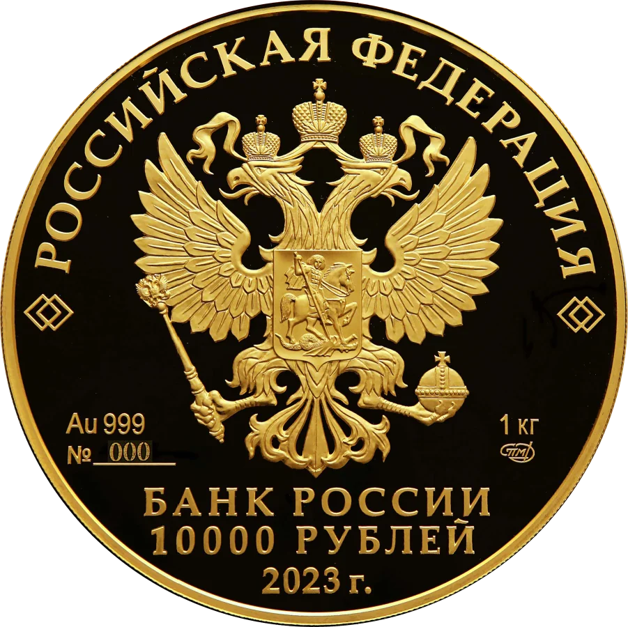 The disc's mirror field features the relief image of the National Coat of Arms of the Russian Federation. Above it, a semicircular inscription reads "РОССИЙСКАЯ ФЕДЕРАЦИЯ," flanked by doubled rhombuses. Below the coat of arms are markings for the metal and fineness on the left, and the fine metal content and mint mark on the right. Centered at the bottom is a three-line inscription: "БАНК РОССИИ," the coin's denomination.