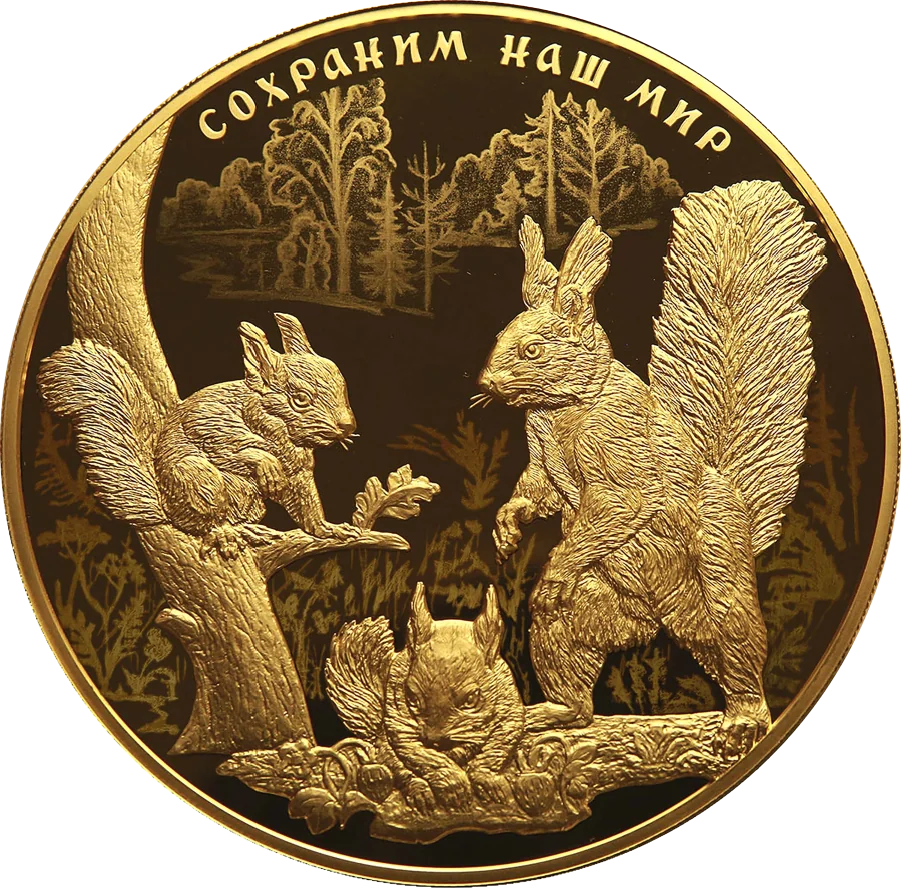 The disc's mirror field features a laser-matte relief of a squirrel with two young against a forest, encircled by the inscription "СОХРАНИМ НАШ МИР" (PROTECT OUR WORLD).