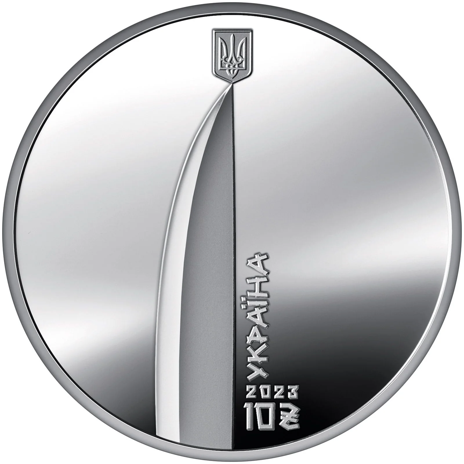 A stylized Ukrainian trident symbolizing the nation at the forefront of history. The blade is on a mirrored background, topped by the small State Coat of Arms. Inscriptions include УКРАЇНА (vertical), the year 2023, the denomination 10, and the hryvnia symbol.