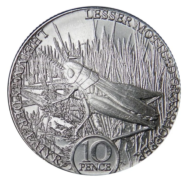 A lesser mottled grasshopper in grass, with Manx text and a circular denomination below.