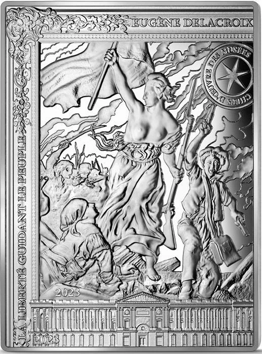 Delacroix's 1830 masterpiece *La Liberté guidant le peuple* features Marianne and Gavroche. The design incorporates the Louvre as part of its frame, and includes the "museum masterpieces" stamp, the painting's title, the artist's name, and the year 2023.