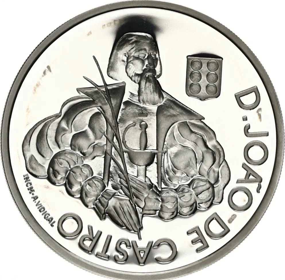 Bust of Viceroy João de Castro, encircled by his name "D. JOÃO DE CASTRO", the engraver "A. VIDIGAL", and the workshop mark "INCM".
