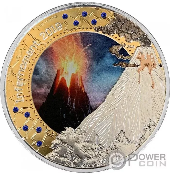 Volcano eruption. The reverse is refined with four precious metals and ten blue gemstones.