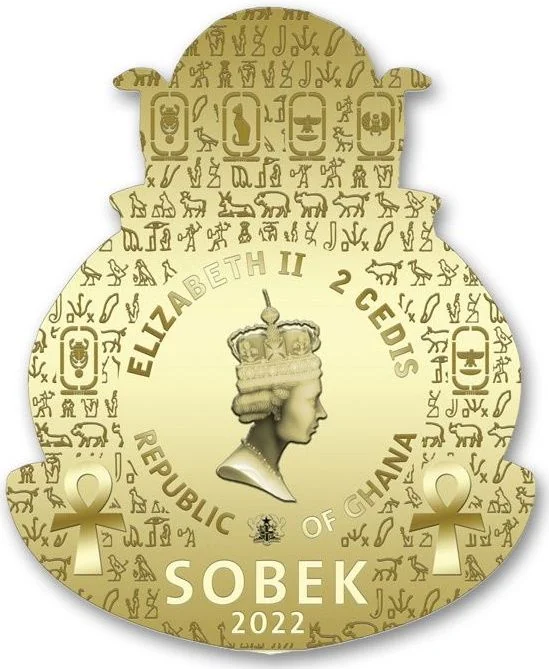 Queen Elizabeth II hieroglyph and effigy above country name.