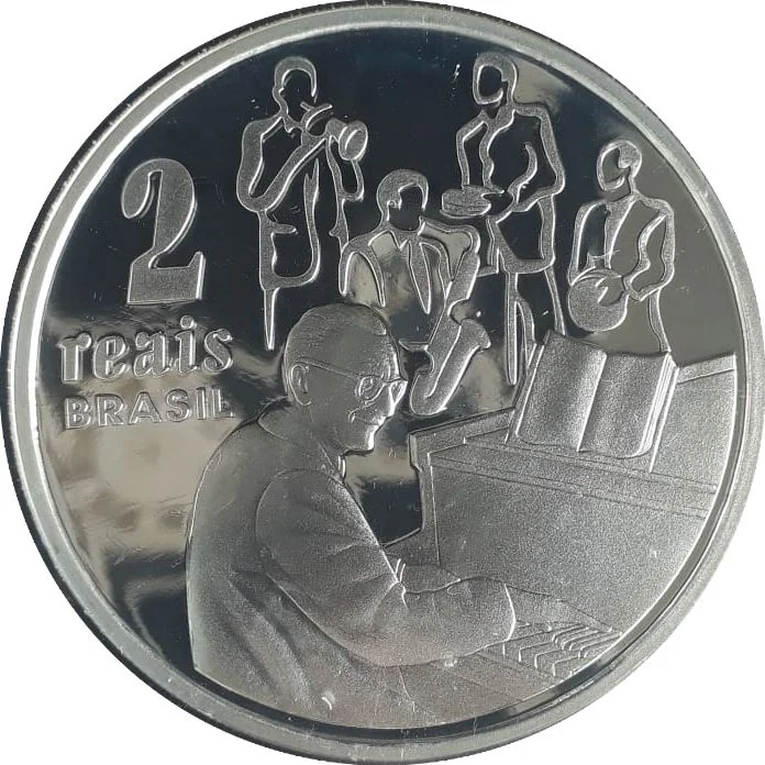 A composer at the piano with a stylized orchestra in the background. It includes the face value "2 REAIS" and the caption "BRASIL".