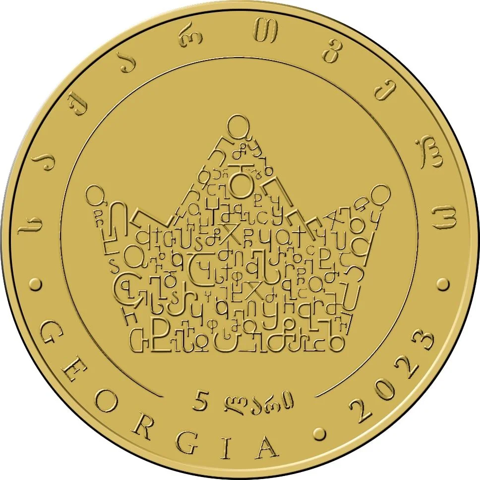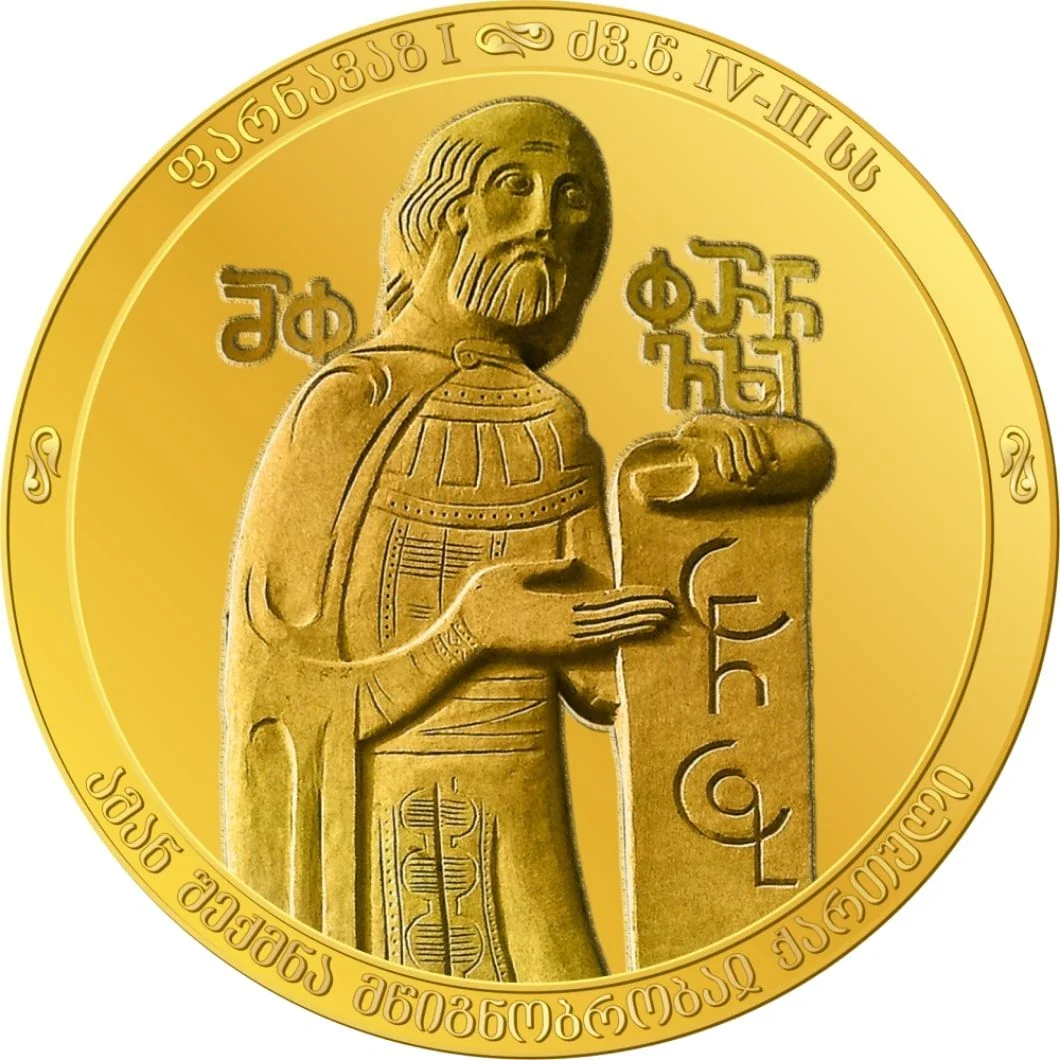Description: King Pharnavaz I of Iberia holds a gilded scroll with Old Georgian Asomtavruli script. Georgian inscriptions encircle the rim.