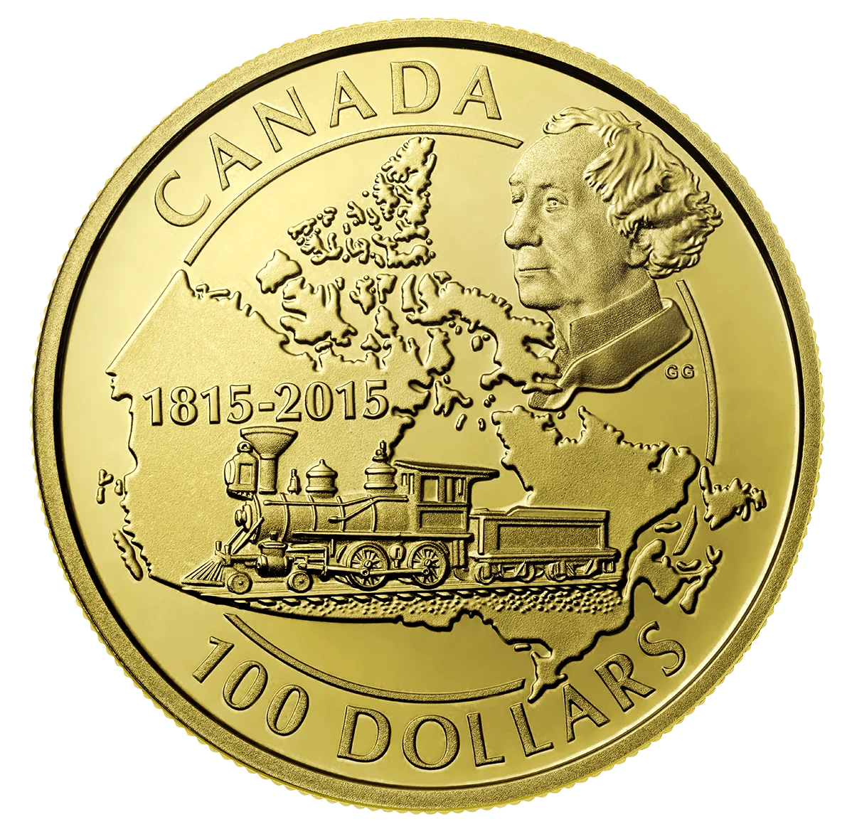 Sir John A. Macdonald with a Canadian Pacific locomotive before a map of Canada.
