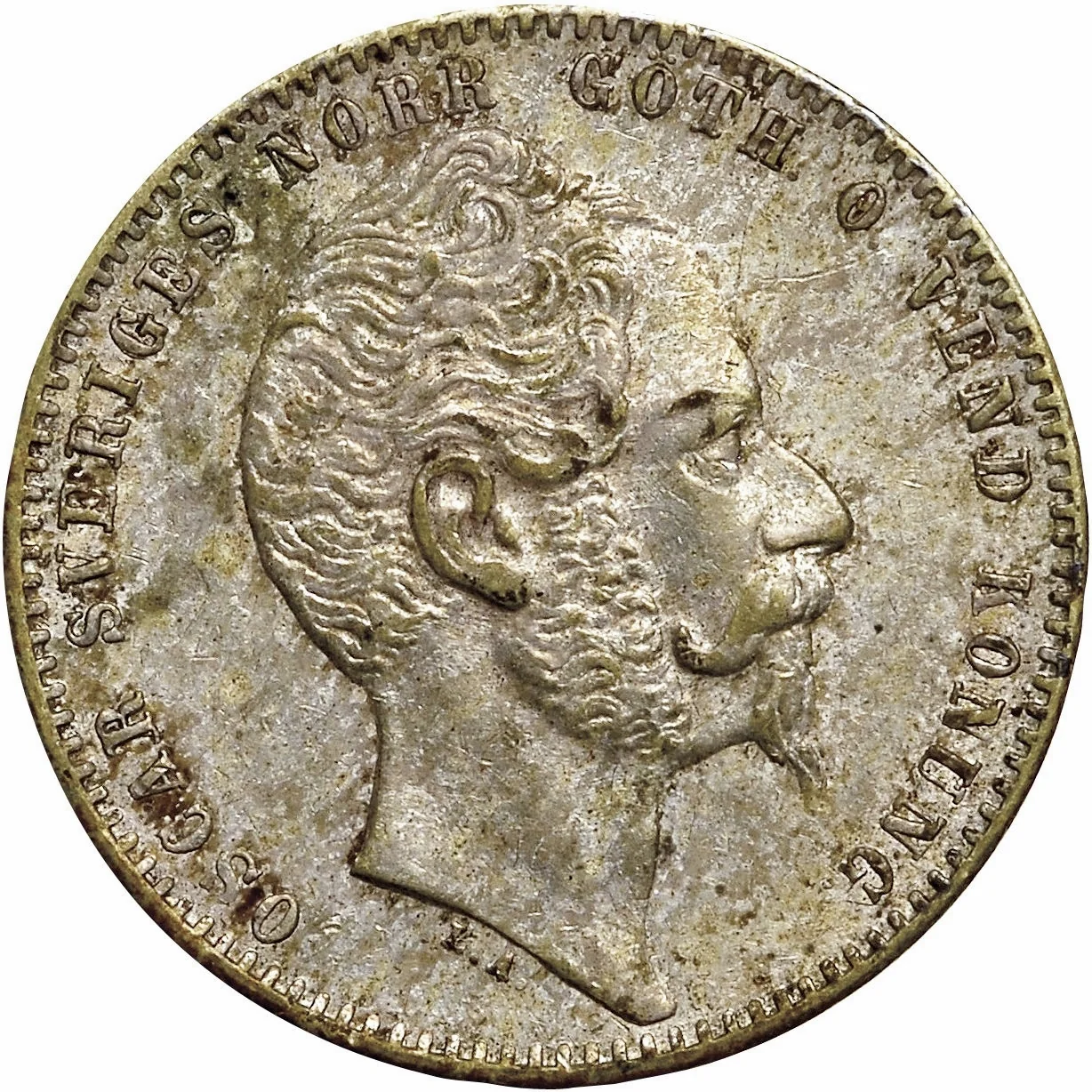 Oscar I of Sweden and Norway, right-facing portrait. Engraver initials below neck, lettering around rim.