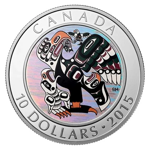 Kwaguilth artist Richard Hunt depicts a mother eagle feeding her eager nestling a minnow as the father arrives with a salmon.