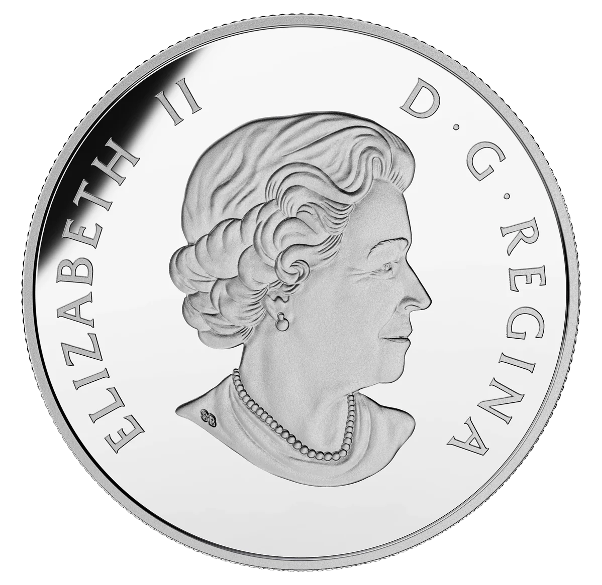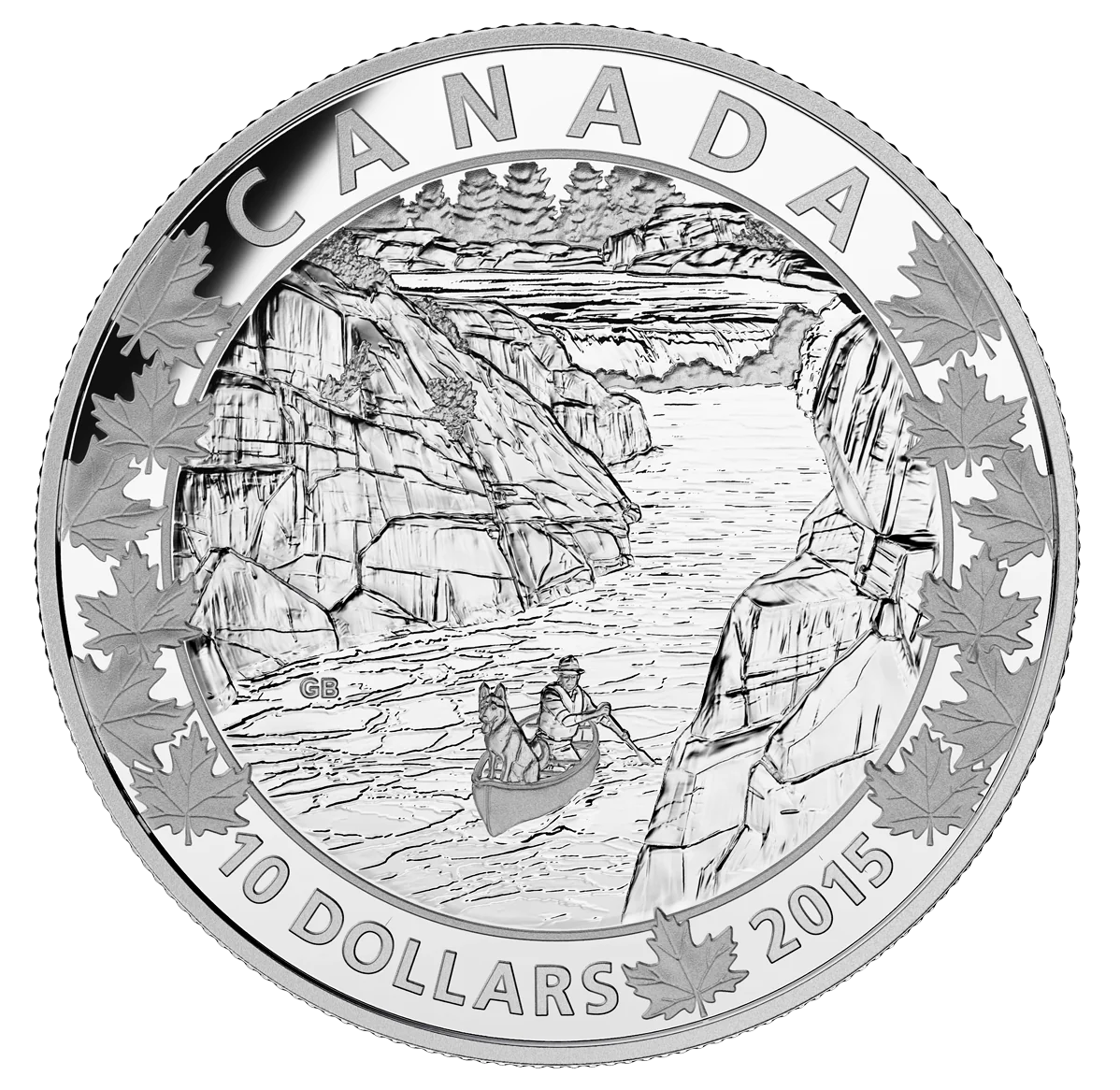 Your coin, designed by Canadian artist Greg Banning, depicts an outdoorsman and his dog canoeing the tumultuous Saint-Jean River in Quebec toward the St. Lawrence. Dwarfed by stone cliffs and the fast-flowing river, the man paddles as his alert dog stands at the bow. Detailed engravings capture the rapids and dense forest, framed by an outer band of maple leaves.